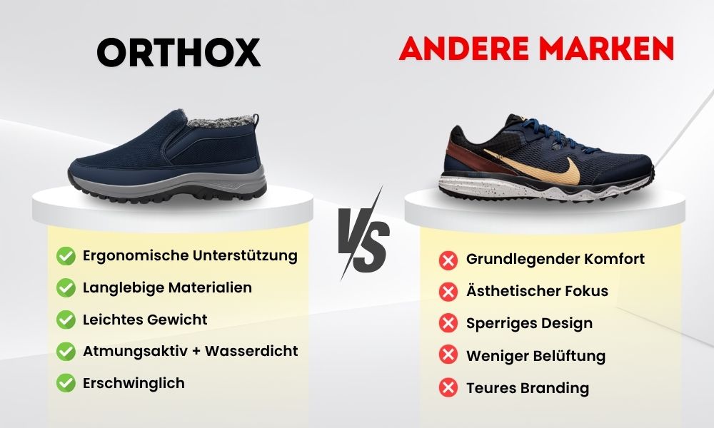 Für dauerhaften Komfort und Schmerzlinderung hebt sich Orthox von herkömmlichem Schuhwerk ab. Während herkömmliche Schuhe ihre Form und Unterstützung verlieren, behält Orthox seine Struktur und bietet lang anhaltenden Komfort.