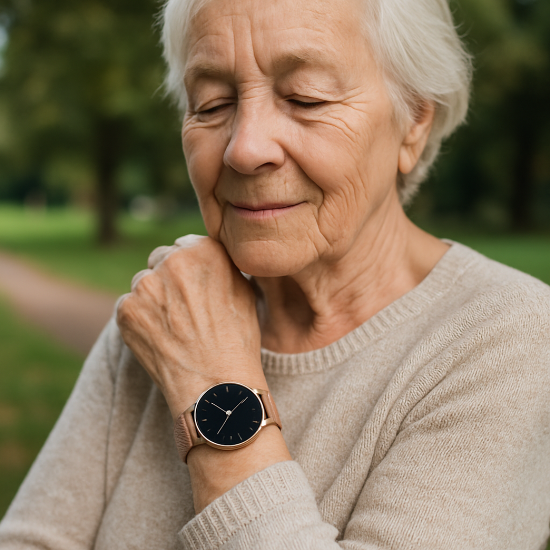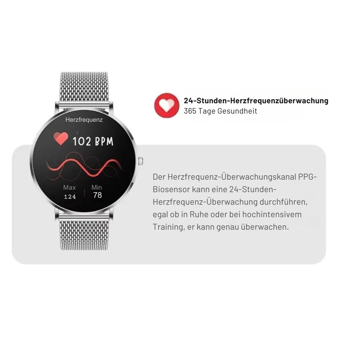 ⭐️⭐️⭐️⭐️⭐️ „Ich fühle mich sicherer, seit ich meine Herzfrequenz und meinen Blutdruck direkt sehen kann. Und das Armband ist richtig edel.“ – Claudia, 61